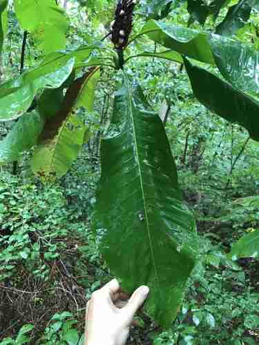 Massive leaves cluster at branch tips, reaching 10 to 24 inches (25 to 61 cm) in length.