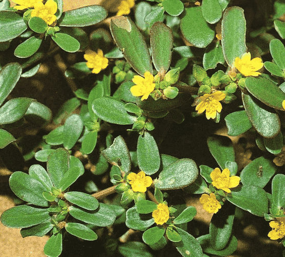 Portulaca oleracea, colloquially known as common purslane, is an annual succulent species with reddish stems and tiny yellow, five-petal flowers. It is used for culinary purposes in various parts of the world, most often raw, in salads. Common purslane is also a good companion plant for crops that thrive in moist soils.