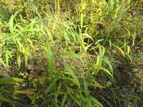 Bamboo-like blades with purplish to wine-colored patterns late in growth season.
