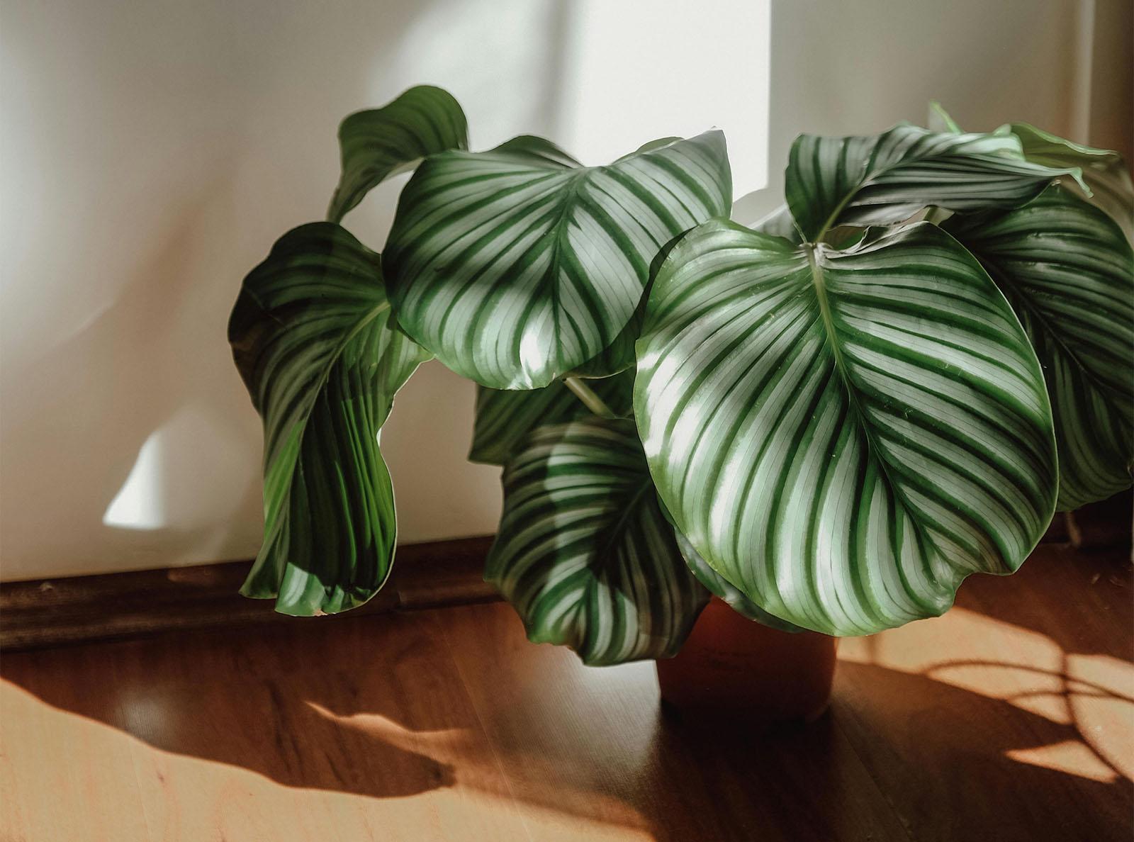 Also called the striped calathea, it has bold, eye-catching leaves with purple undersides. It prefers warm rooms and bright, indirect light. Mist every few days and water weekly, or wait until the top 2 inches of soil dry out.