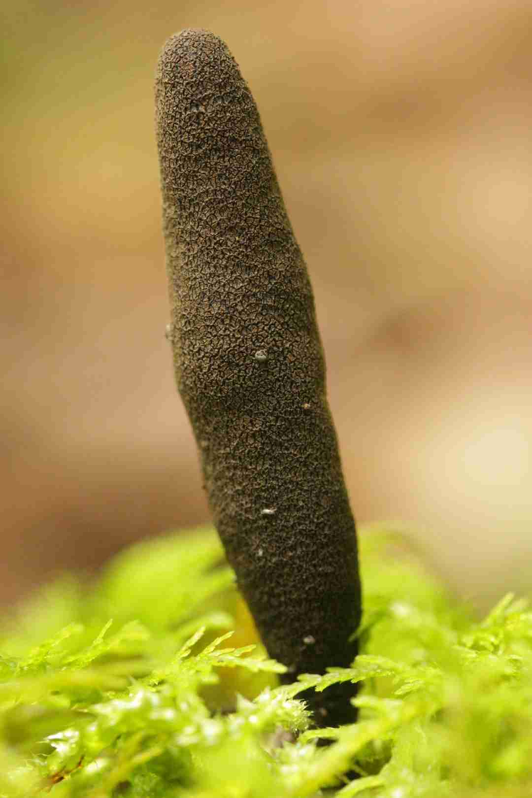 2.5 - 7 cm tall; club-shaped with a rounded tip; black, covered with black to rusty brown or reddish fuzz near the base