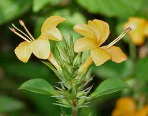 Barleria prionitis can be identified by its erect habit and thorny stems. The leaves are ovate to lanceolate with a shiny surface. The flowers are yellow, borne on spikes, and typically have a five-lobed calyx. The presence of spines on the stems and branches is a distinguishing feature.