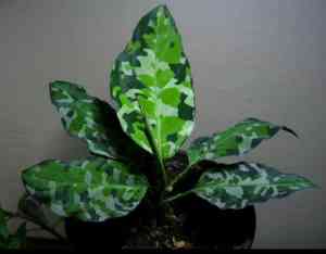 Adelonema wallisii (synonym Homalomena wallisii ) is a species of flowering plant in the family Araceae native to Venezuela, Colombia, and Panama. It reaches about 15 cm in height but with a much wider spread. The leaf blades are elliptic to ovate-oblong in shape about 13 to 20 cm in length, on rather short stalks, arching or recurving, bright-green with a markings of a marbled yellow. It can be confused with the rather similar Aglaonema.