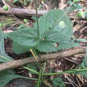 Look for its distinctive tall herbaceous growth, with leaves that have serrated edges and a somewhat glossy surface. The plant typically produces small white or purplish flowers.