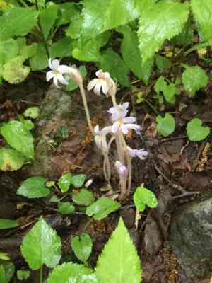 Look for a single flower on a leafless stem. The flower is tubular and can vary in color from whitish to purple. The plant is small and can be overlooked as it often resembles dried stems.