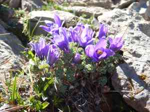 Jones' columbine (Aquilegia jonesii) is a perennial plant notable for its vibrant blue to violet flowers, which feature distinctive curved spurs. The plant has finely divided, fern-like leaves and a compact growth form, making it well-suited to high-altitude, rocky alpine environments. Found primarily in the western United States, Jones' columbine typically blooms from late spring to early summer, offering a brief but beautiful display that attracts various pollinators with its nectar-rich flowers.