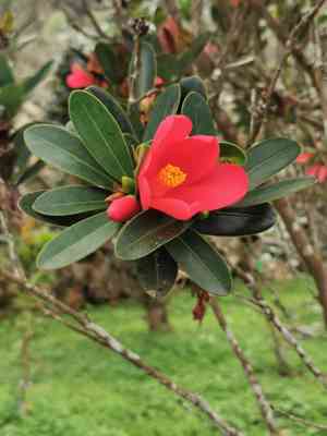 The camellia azalea hails from the mountainous regions of Guangdong Province in China. This evergreen plant can be classified as both a shrub and a small tree, reaching heights of up to 4 meters. Its notable large, vibrant red flowers have an extended blooming period, lasting from mid-spring all the way through winter.