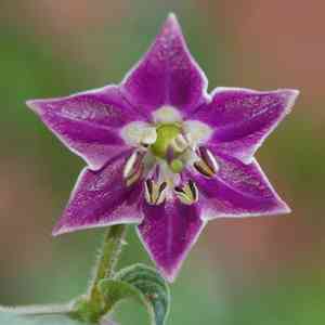 Look for hairy leaves and stems, a distinguishing feature of this species. The flowers typically have purple petals with green spots. The fruit is thick-walled and can be red, yellow, or purple.