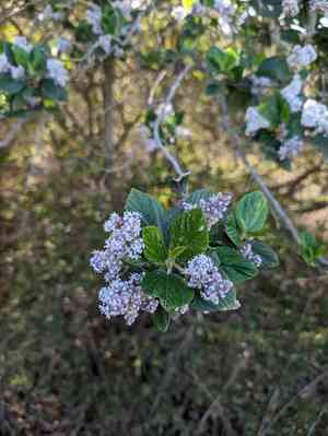 Feltleaf ceanothus (Ceanothus arboreus) is an evergreen shrub that can reach up to 7 meters in height. Its felt-like leaves are a favorite for deer. Blooming from spring to summer, it produces lilac-blue flowers that attract bees. For optimal growth, it requires well-drained soil, preferably sandy loam or rich soil, and thrives in full sun to partial shade.