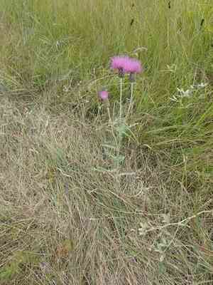 The Flodman's thistle is a robust perennial known for its extensive root system and spiny, woolly leaves. It displays notable rose-purple blooms on leafy stems, flourishing in North America's open grasslands. Its prickly leaves and stems provide protection from grazing animals, helping it thrive in wild meadows and prairie environments.
