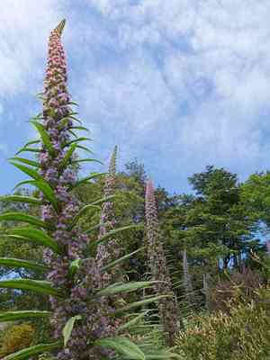 Giant viper's-bugloss (Echium pininana) is a dramatic biennial or triennial plant known for its towering flower spikes, adorned with numerous blue or violet blossoms. These tall, missile-like spikes make a striking visual statement in any garden setting.