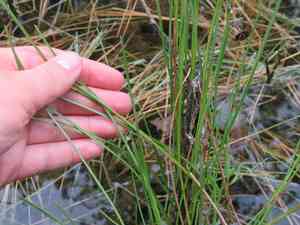 This plant can be identified by its thin, grass-like stems that are typically 20-60 cm tall. The stems are usually smooth, green, and tapering to a point. The plant forms dense clumps and has small, inconspicuous flowers.