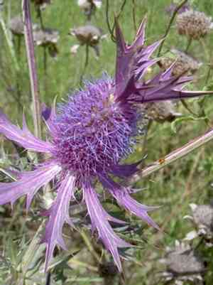 Look for the spikey, branched stems with purple or blue bracts and small thistle-like flowers. The leaves are deeply lobed with spiny margins, and the plant typically grows up to 1 meter in height.