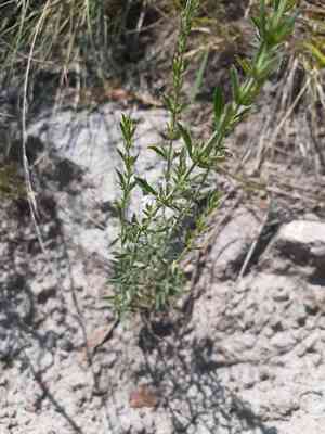 Hedeoma dentata can be identified by its small, opposite leaves that are narrow and toothed. It also produces small, lavender flowers, which are typical of the mint family.