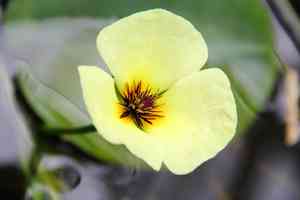 Short-lived lemon-yellow flowers with distinctive brown center, blooming above foliage, lasting one day.