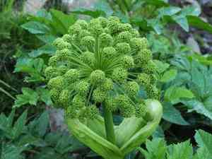 Compound umbels of small white and yellowish flowers.