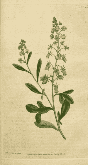 Reseda odorata can be identified by its small, dense clusters of greenish-white flowers and its distinctive fragrance. The leaves are oblong, slightly toothed, and can have a somewhat sticky texture.