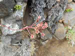 Look for a plant with rosettes of spoon-shaped leaves that often have a silvery crust. The leaves are generally evergreen. The flowers are small, star-shaped, and white, often with yellow or reddish spots, blooming on tall, branching flower stalks.
