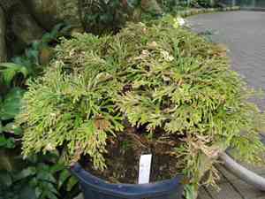 Selaginella tamariscina is an evergreen fern ally that reaches up to 15 cm in height. It features densely tufted stems and roots, creating a small tree-like structure. This plant is typically found in humid environments and is also cultivated for its distinctive foliage, making it popular in gardens and as potted plants.