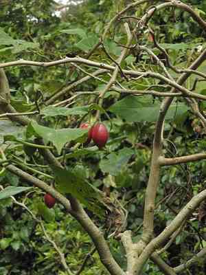 The tamarillo (Solanum betaceum), commonly known as the tree tomato, is a small tree or shrub that belongs to the nightshade family and originates from the Andes. This plant can reach heights of up to 5 meters. Its edible fruit, which resembles a tomato, comes in a variety of colors including yellow, orange, red, and purple. Tamarillos are widely cultivated in subtropical regions globally.